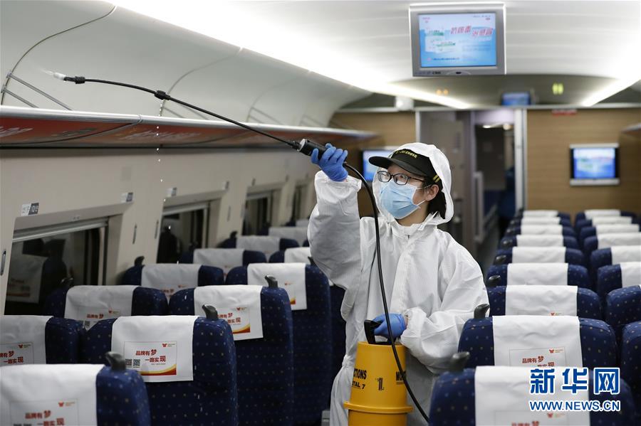 4月7日,武漢動車段運用車間工作人員周明輝在給列車消毒。 新華社記者 沈伯韓 攝