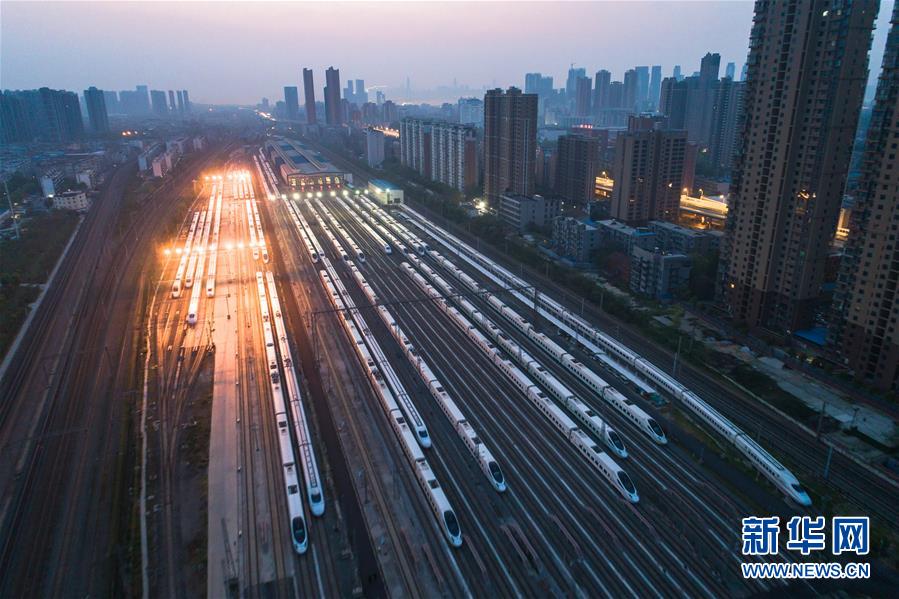 4月8日,在武漢動車段,列車??吭诖孳嚲€上準備投入運行(無人機照片)。 新華社記者 肖藝九 攝