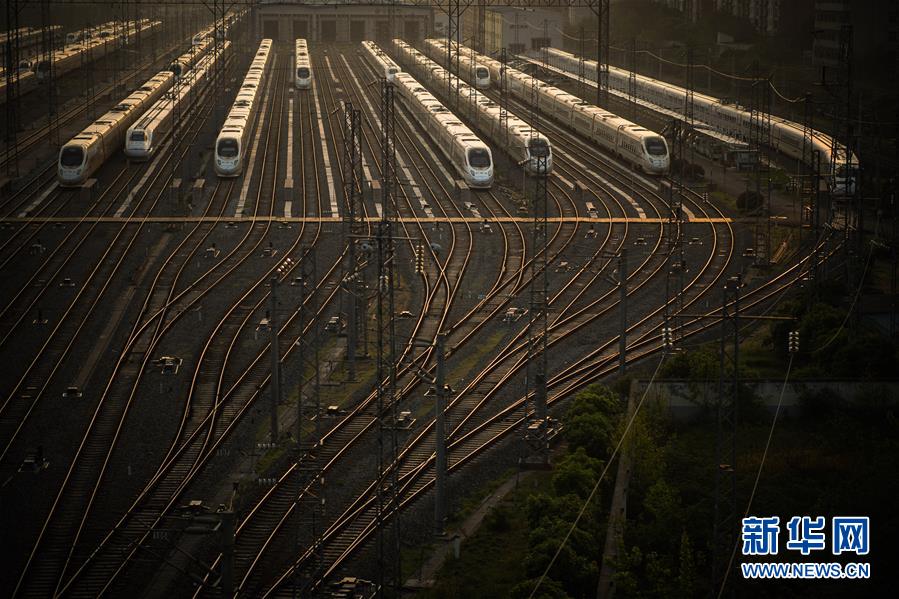 4月8日,在武漢動(dòng)車段,列車停靠在存車線上準(zhǔn)備投入運(yùn)行。 新華社記者 肖藝九 攝