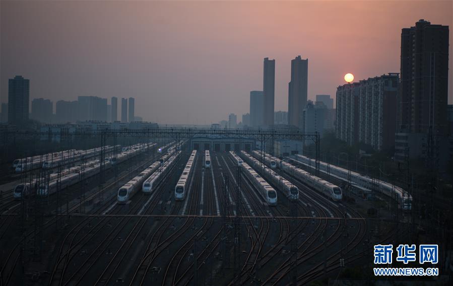 4月8日,在武漢動(dòng)車段,列車停靠在存車線上準(zhǔn)備投入運(yùn)行。 新華社記者 肖藝九 攝