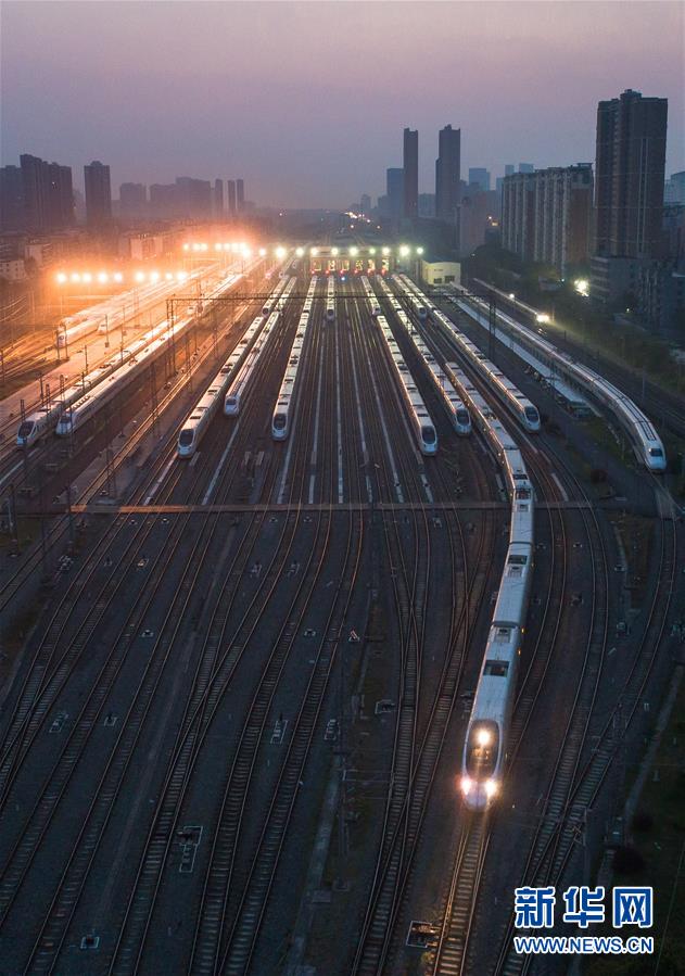 4月8日,一列動(dòng)車從武漢動(dòng)車段駛出,開(kāi)往漢口站迎接旅客(無(wú)人機(jī)照片)。 新華社記者 肖藝九 攝