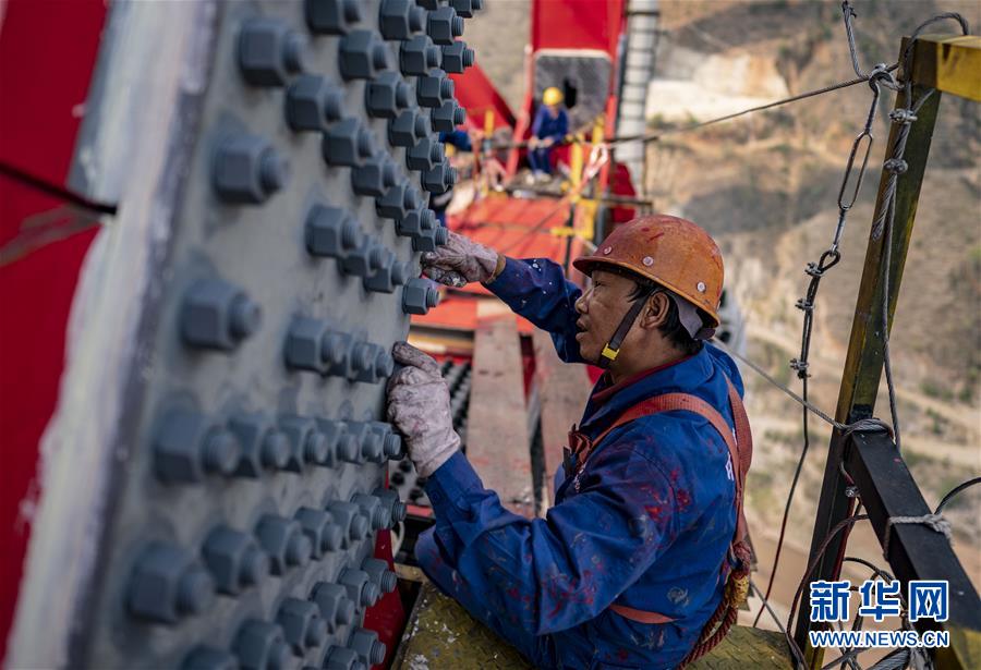 在位于普洱市的木乃河雙線特大橋工程現(xiàn)場(chǎng),工人鐘琪在檢查螺絲緊固情況(4月12日攝)。新華社記者秦晴攝