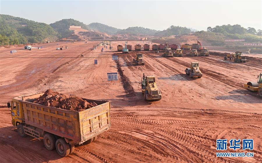 普洱車站施工現(xiàn)場(chǎng)正在進(jìn)行路基土方填筑施工(4月12日攝)。新華社記者秦晴攝