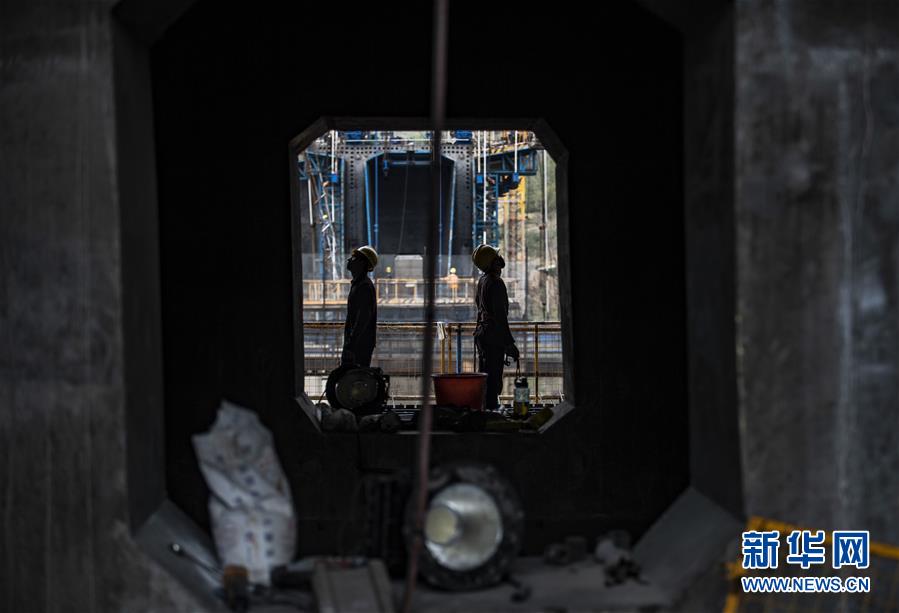 4月8日,兩名中鐵四局職工安裝架設(shè)鋼桁梁,每節(jié)鋼桁梁間的精度需要達(dá)到毫米級(jí)才能保證安裝到位。新華社記者江文耀攝