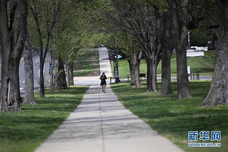 4月8日,在美國(guó)首都華盛頓,一名戴口罩的男子行走在空曠的步行道上。新華社記者劉杰攝