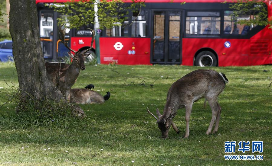 4月8日,在英國倫敦東部一個(gè)居民區(qū),附近公園里的鹿在草坪上吃草。隨著新冠疫情在英國的擴(kuò)散,政府要求人們減少不必要的外出。倫敦東部一個(gè)居民區(qū)附近公園里原來散養(yǎng)的鹿紛紛從公園走出來,或吃草或接受附近居民的喂食,成為特殊時(shí)期居民區(qū)里的新“客人”。新華社記者韓巖攝