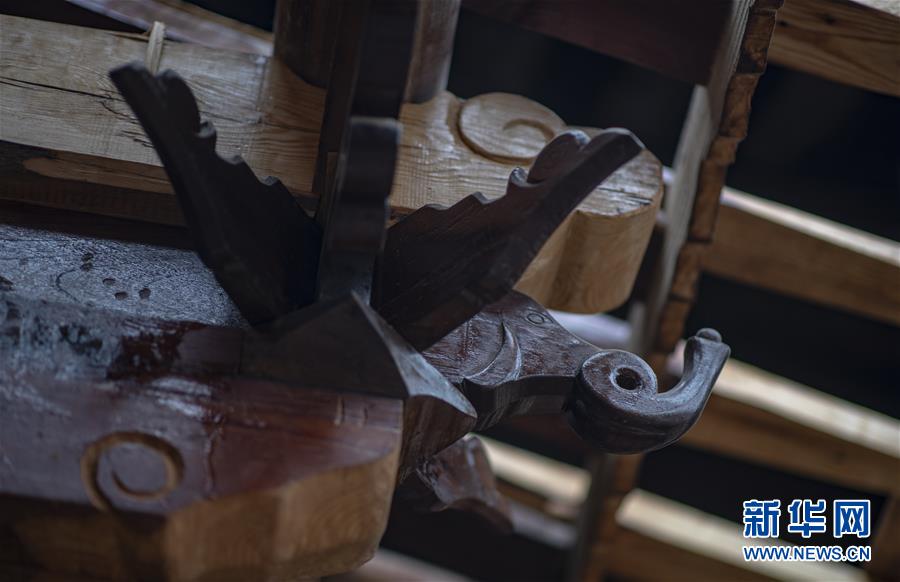 石屏縣異龍鎮(zhèn)符家營(yíng)村211號(hào)民居中修繕完成的木斗拱(8月8日攝)。新華社記者江文耀攝