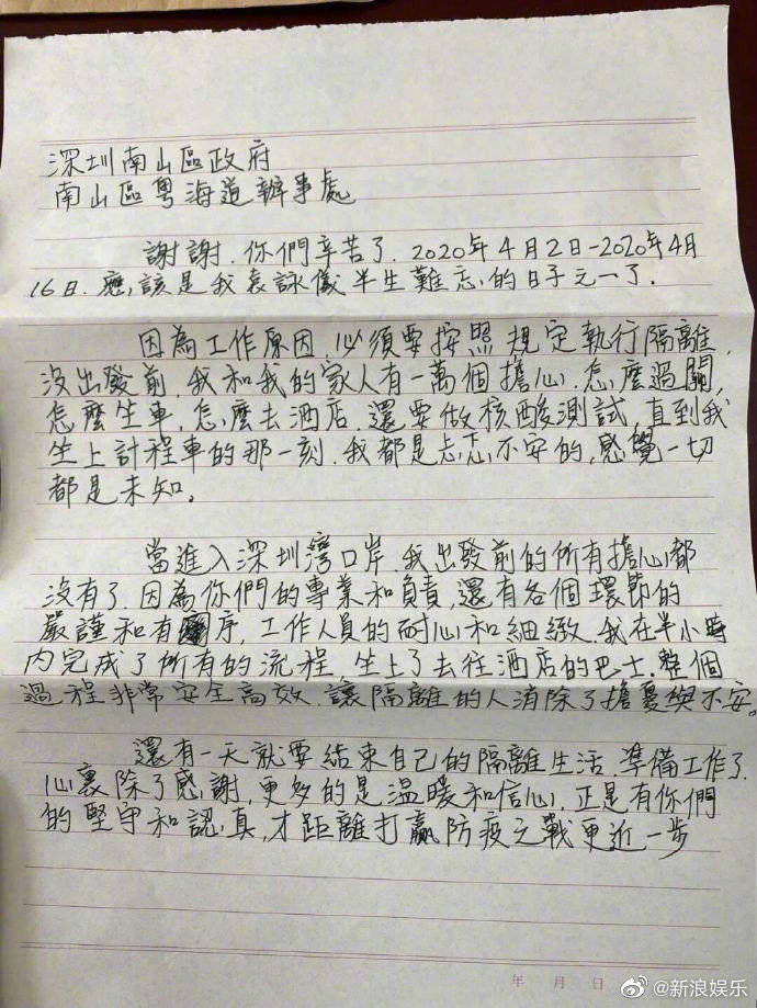 她在信中說,出發(fā)前,她和家人十分擔(dān)心,不知如何過關(guān)、坐車、去酒店,但進入深圳灣口岸后,她所有的擔(dān)心都沒有了,因為有了大家的專業(yè)和負責(zé),各個環(huán)節(jié)的嚴謹和有序,工作人員的耐心和細致,她在半小時內(nèi)就完成所有流程,坐上了去酒店的巴士。信里,袁詠儀對政府工作人員表示了感謝,“就像星星,我無法始終看見他們,但是我知道他們永遠在那里。”