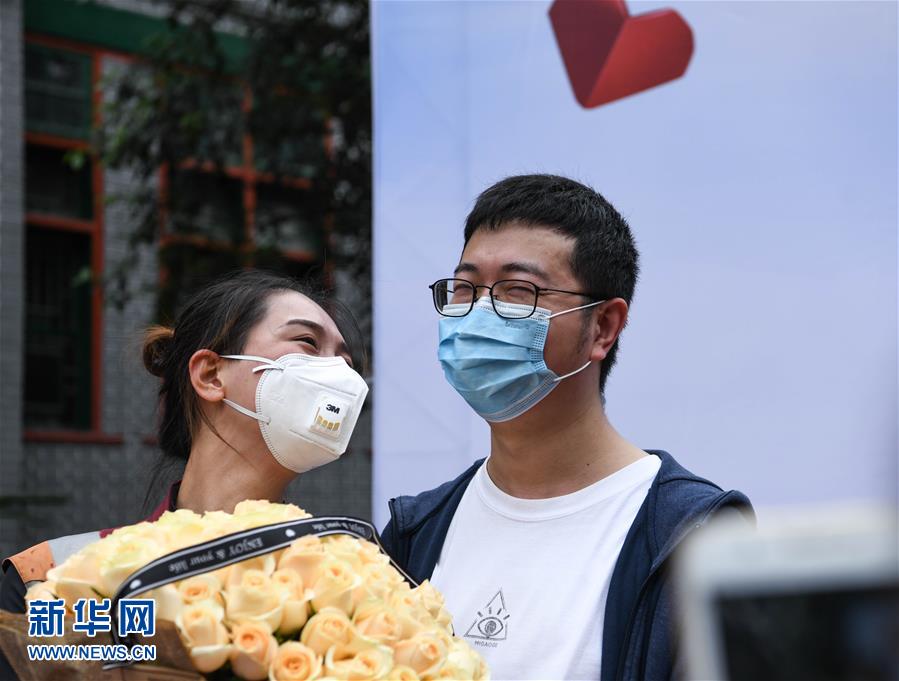 4月21日,在四川大學(xué)華西醫(yī)院,醫(yī)療隊隊員接受男友的捧花。當(dāng)日,來自四川大學(xué)華西醫(yī)院、華西第二醫(yī)院、華西第四醫(yī)院的醫(yī)療隊隊員解除隔離休整,與分別許久的家人、同事團(tuán)聚,緊緊相擁。新華社記者王曦攝