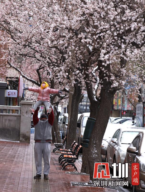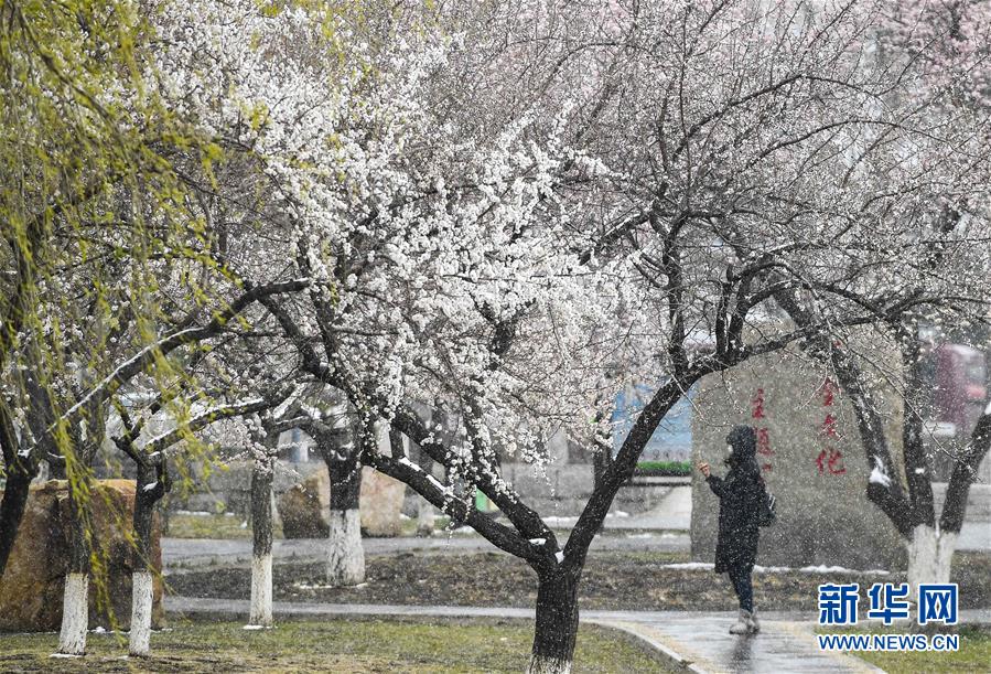 4月21日,在長春市杏花村公園,市民在雪中拍照留念。當(dāng)日,吉林省多地迎來降雪天氣。新華社記者許暢攝