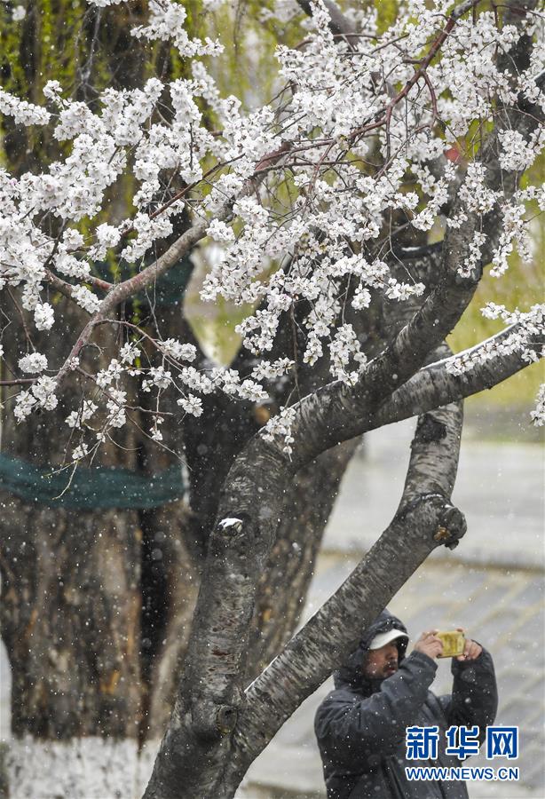 4月21日,市民在長春市杏花村公園觀賞雪景。當(dāng)日,吉林省多地迎來降雪天氣。新華社記者許暢攝