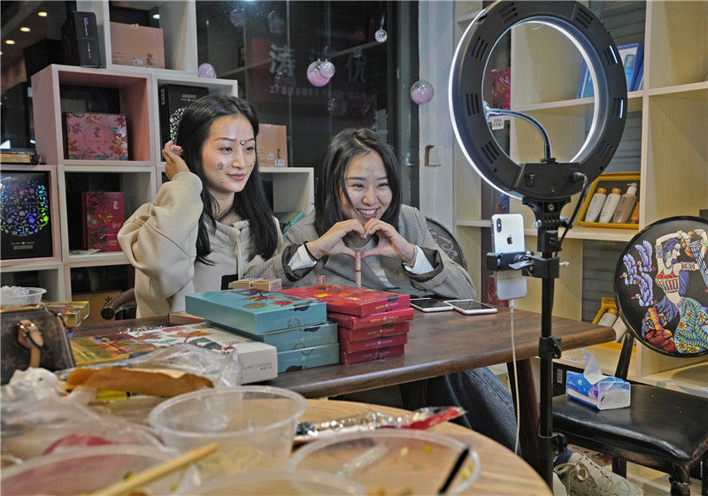 2019年11月10日,浙江金華,義烏北下朱村,倆主播在銷售化妝品,一個(gè)主播做出愛心的手型,對(duì)她們的“老鐵”(粉絲)示好。