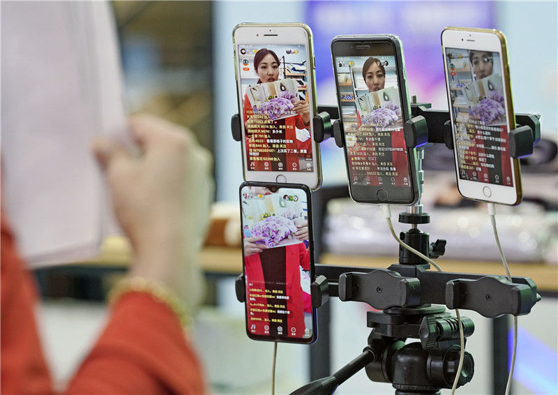 2019年11月9日,浙江金華,義烏北下朱村,倆主播在直播銷售保暖內(nèi)衣。