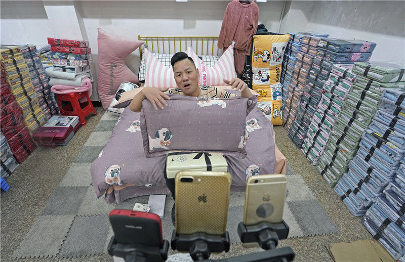 2019年11月11日,浙江金華,義烏北下朱村,在一家床上用品銷售商店,一名男子正在直播。這個(gè)網(wǎng)名叫“點(diǎn)子大哥”的男子姓劉,49歲,來(lái)自杭州農(nóng)村,有三年半的直播經(jīng)歷。