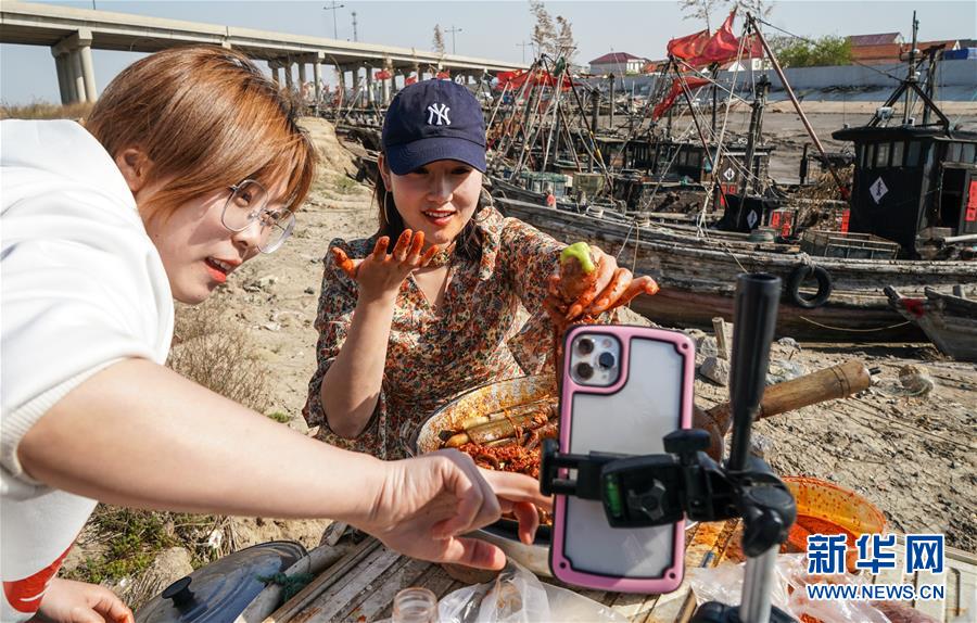 4月22日,馬花雨(下右)、徐紅紅(上)、陸倩(下左)在漁船上拍攝推銷海產(chǎn)品的短視頻。近年來(lái),江蘇省連云港市贛榆區(qū)海頭鎮(zhèn)越來(lái)越多的居民開始直播銷售海產(chǎn)品,當(dāng)?shù)貪O船、碼頭和市場(chǎng)上活躍著一批網(wǎng)絡(luò)直播好手。目前,全鎮(zhèn)有3000多戶商家從事海產(chǎn)品直播銷售業(yè)務(wù),形成了集捕撈、加工、包裝、銷售和物流于一體的電商產(chǎn)業(yè)鏈。新華社記者楊磊攝