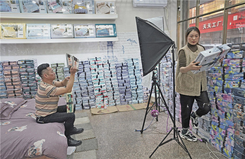 2019年11月10日,江金華,義烏北下朱村,在店鋪里直播銷售床上用品的兩個(gè)店員。