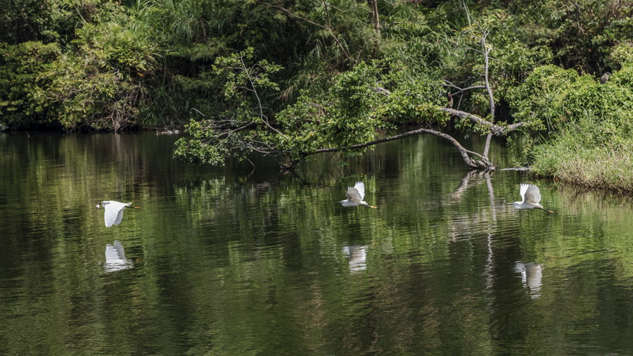 4月15日,攝于南山區(qū)華僑城天鵝堡附近。這是深圳拍鷺鳥的其中一個好去處。左一白鷺捕到食物,后方兩只白鷺追趕。徐捷攝