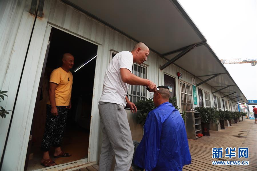 4月25日,返崗后的工人在海上生活區(qū)幫助工友理發(fā)。新華社記者盧燁攝
