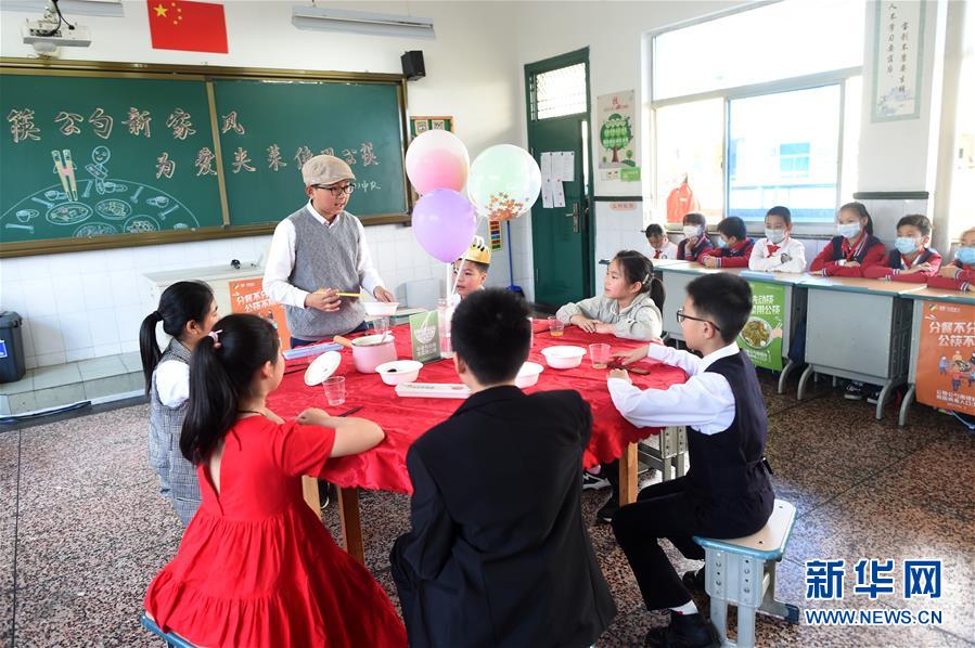 4月30日,諸暨市暨陽小學五年級4班學生在表演家庭用餐時使用公筷公勺的情景劇。當日,浙江省諸暨市暨陽小學五年級4班開展“公筷公勺新家風”主題班會活動,通過海報設計、情景劇表演等強化孩子們使用公筷公勺的意識,倡導文明用餐。新華社記者 韓傳號 攝