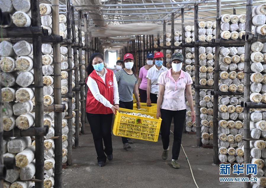 唐莉(左一)在平樂縣張家鎮(zhèn)食用菌生產(chǎn)基地幫工人搬運(yùn)袖珍菇(5月4日攝)。新華社記者周華攝
