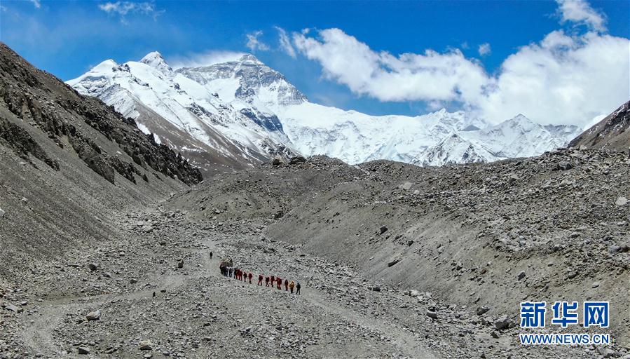 5月6日,登山隊(duì)員們向更高海拔進(jìn)發(fā)(無人機(jī)照片)。新華社記者晉美多吉攝