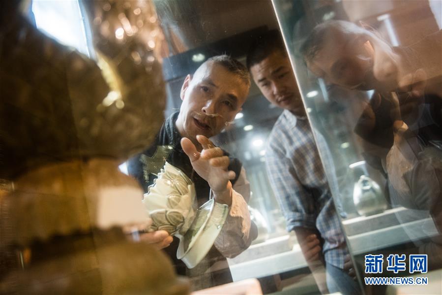 5月8日,項(xiàng)宏金(左)在龍泉青瓷裝飾紋樣研究所向來(lái)訪的年輕瓷人介紹兩件蓮瓣紋作品的細(xì)節(jié)。1965年出生的項(xiàng)宏金,被浙江龍泉年輕一代瓷人稱為“項(xiàng)哥”,他從20世紀(jì)90年代開始收集龍泉青瓷標(biāo)本,研究青瓷紋樣。2014年出版著作《龍泉青瓷裝飾紋樣》,次年開設(shè)龍泉青瓷裝飾紋樣研究所,將自己收藏的千余件標(biāo)本跟瓷器愛好者、創(chuàng)作者免費(fèi)分享。新華社記者翁忻旸攝