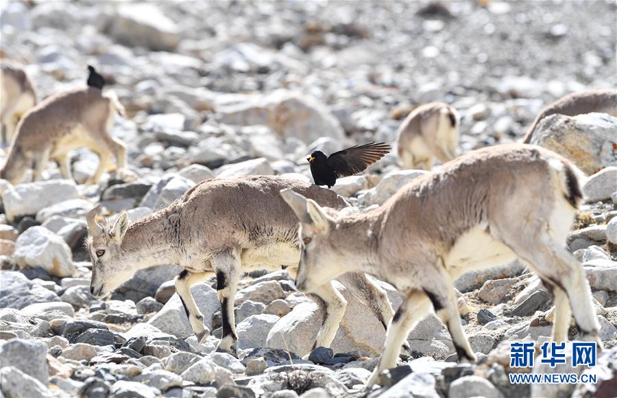 黃嘴山鴉停留在巖羊身上(5月8日攝)。當(dāng)日,一群巖羊在珠峰大本營周圍覓食,黃嘴山鴉飛到巖羊身上停留,構(gòu)成一幅幅生動(dòng)有趣的雪域圖畫。新華社記者晉美多吉攝