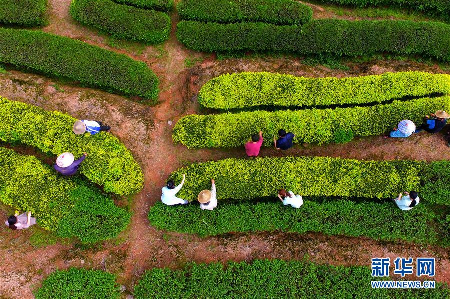 游玉瓊和方舟帶著公司員工抓緊采摘武夷巖茶中的白雞冠品種(無人機照片,5月10日攝)。新華社記者魏培全攝