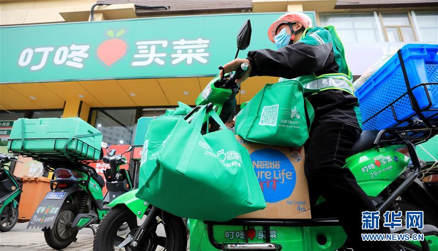 一名外送員從叮咚買菜上海浦東云山路前置倉(cāng)出發(fā)送貨(4月17日攝)。新華社記者方喆攝