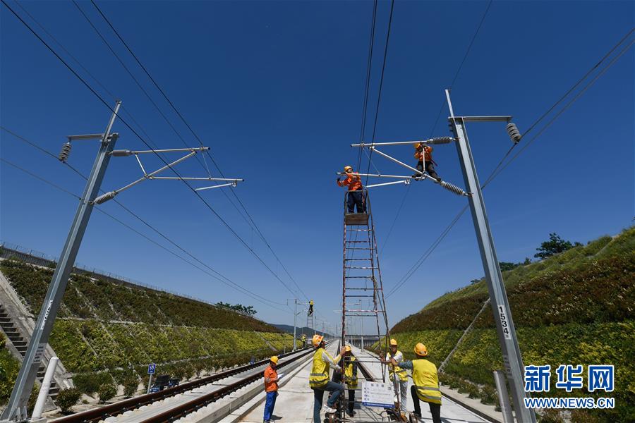 5月12日,中國(guó)鐵路上海局集團(tuán)公司上海高鐵維修段的技術(shù)人員在商合杭高鐵浙江湖州段調(diào)整接觸網(wǎng)。近日,商合杭高鐵合肥至湖州段聯(lián)調(diào)聯(lián)試正有條不紊進(jìn)行中。中國(guó)鐵路上海局集團(tuán)公司上海高鐵維修段抽調(diào)49名精兵強(qiáng)將,持續(xù)對(duì)管轄范圍內(nèi)的高鐵線路、信號(hào)、接觸網(wǎng)線進(jìn)行調(diào)試,為下一階段打下基礎(chǔ)。據(jù)了解,商合杭高鐵合湖段聯(lián)調(diào)聯(lián)試之后將轉(zhuǎn)入運(yùn)行試驗(yàn)階段,驗(yàn)收合格并通過(guò)安全評(píng)估后,力爭(zhēng)6月底具備開(kāi)通運(yùn)營(yíng)條件。新華社記者黃宗治攝
