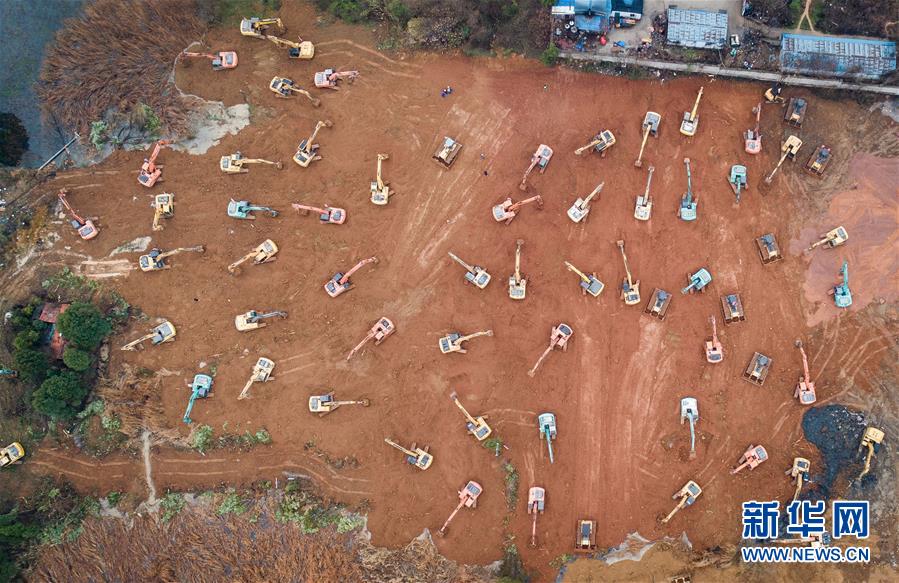 大型機械在武漢火神山醫(yī)院建設工地施工(1月24日攝,無人機照片)。新華社記者肖藝九攝