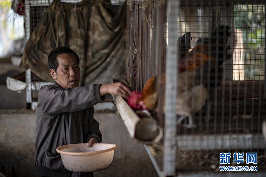 村民在統(tǒng)一修建的雞舍里喂雞(3月28日攝)。新華社記者江文耀攝