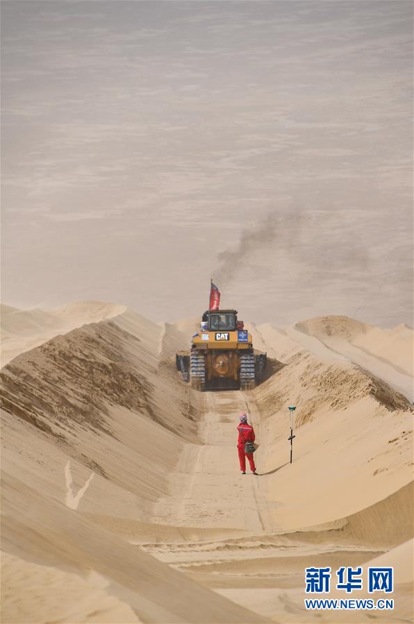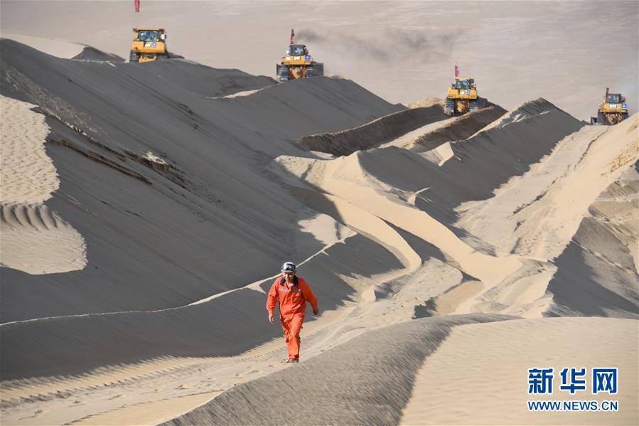 世界第二大流動沙漠——塔克拉瑪干沙漠東部腹地,風(fēng)依舊在吹。極細(xì)的沙粒隨風(fēng)飄蕩,無孔不入。新疆尉犁至且末沙漠公路施工現(xiàn)場仍是機器轟鳴,多臺大型推土機一字排開,將高聳的沙山緩緩?fù)破健?/p>