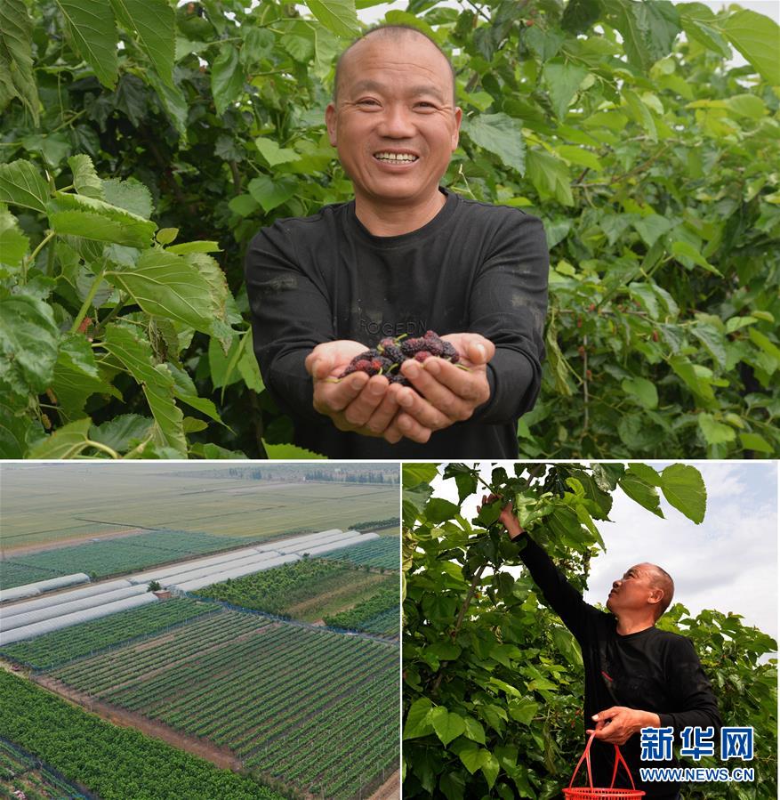 這是一張拼版照片(圖片均為5月16日攝)。上圖:河南省開封市尉氏縣大橋鄉(xiāng)十里鋪村村民孫根馬展示采摘的桑葚;下左圖:在扶貧政策扶持下,孫根馬流轉(zhuǎn)60多畝土地種植桑葚、葡萄、無花果等(無人機照片);下右圖:孫根馬在他經(jīng)營的桑葚種植園內(nèi)采摘桑葚。新華社記者孫清清攝