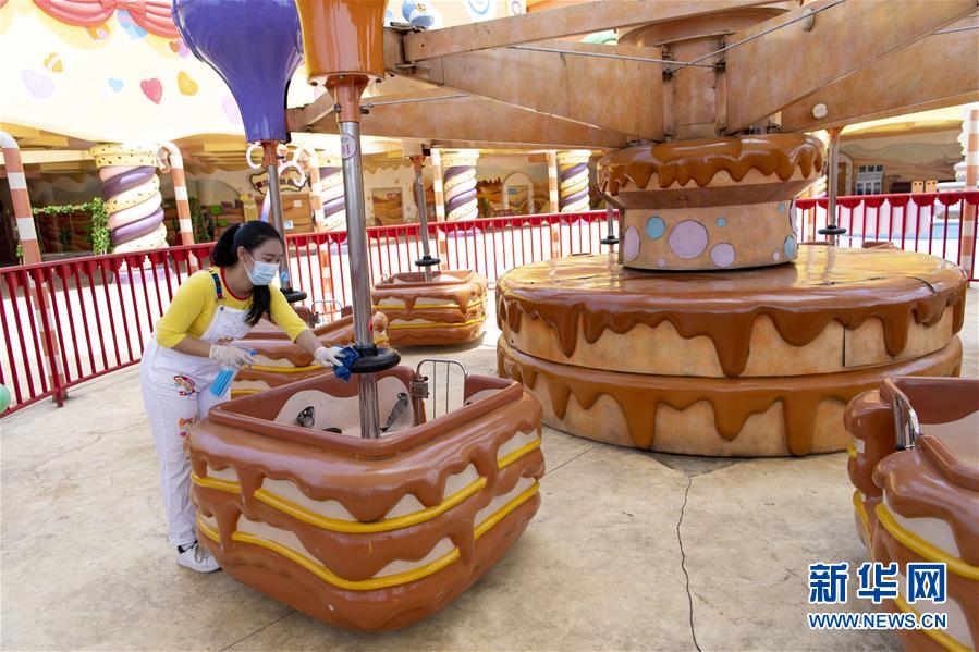 5月19日,工作人員對(duì)游樂(lè)設(shè)施進(jìn)行消毒。當(dāng)日,湖北武漢歡樂(lè)谷重新開(kāi)放。園區(qū)執(zhí)行客流量管控,游客需通過(guò)網(wǎng)上預(yù)約才能進(jìn)入,室內(nèi)場(chǎng)館暫不開(kāi)放。新華社記者熊琦攝