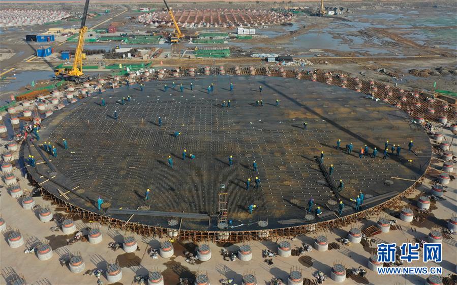5月23日,工人在唐山市曹妃甸區(qū)LNG項目第一階段工程儲罐建設工地施工(無人機照片)。新華社記者楊世堯攝