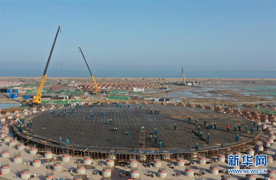 5月23日,工人在唐山市曹妃甸區(qū)LNG項目第一階段工程儲罐建設工地施工(無人機照片)。