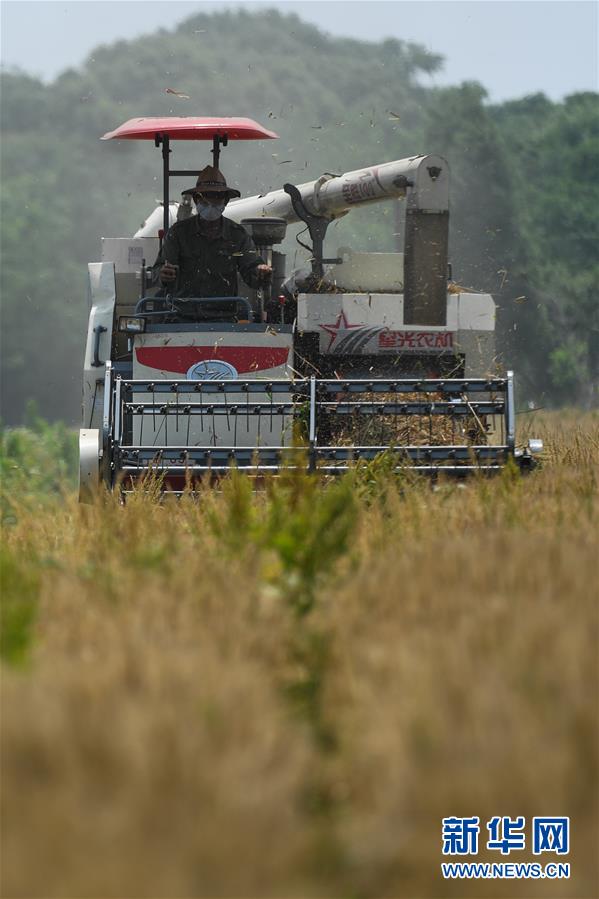 5月24日,農(nóng)戶駕駛收割機(jī)在浙江省湖州市吳興區(qū)八里店鎮(zhèn)尹家圩糧油植保農(nóng)機(jī)專業(yè)合作社的麥田里進(jìn)行收割作業(yè)。新華社記者黃宗治攝
