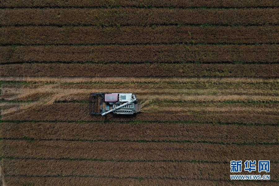 5月24日,農(nóng)戶駕駛收割機(jī)在浙江省湖州市吳興區(qū)八里店鎮(zhèn)尹家圩糧油植保農(nóng)機(jī)專業(yè)合作社的麥田里進(jìn)行收割作業(yè)(無(wú)人機(jī)照片)。新華社記者黃宗治攝