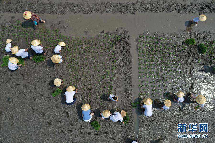5月24日,小朋友與家長在稻田里參加親子插秧比賽(無人機(jī)照片)。當(dāng)日,十余名小朋友在家長的帶領(lǐng)下來到浙江省湖州市吳興區(qū)八里店鎮(zhèn)尹家圩糧油植保農(nóng)機(jī)專業(yè)合作社的稻田中,參加親子插秧、稻田捉魚等農(nóng)事體驗(yàn)活動。新華社記者黃宗治攝