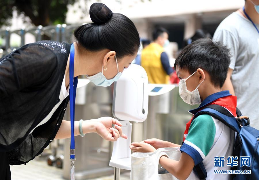 5月25日,廣州市荔灣區(qū)蔣光鼐紀念小學的老師在校門口指導返校的學生進行手部消毒。當日,廣州市各小學一至三年級學生正式開學復課。至此,廣州市中小學各年級已全部開學復課。新華社記者盧漢欣攝