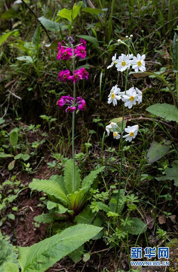 在四川省漢源縣桌子山,一株紅色的報(bào)春花旁生長著一株白色的報(bào)春花(5月24日攝)。新華社記者江宏景攝