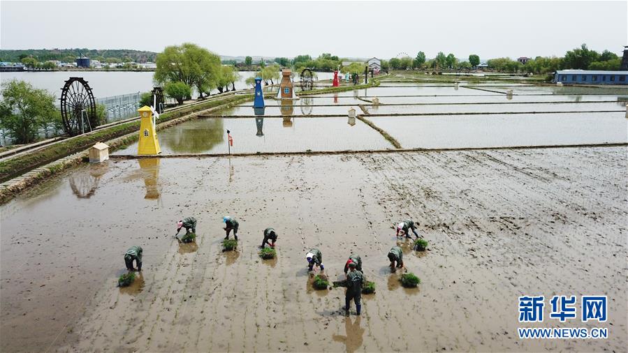 這是5月22日拍攝的農(nóng)民在寧安市渤海鎮(zhèn)上官地村一塊稻田中插秧(無(wú)人機(jī)照片)。新華社記者王建威攝