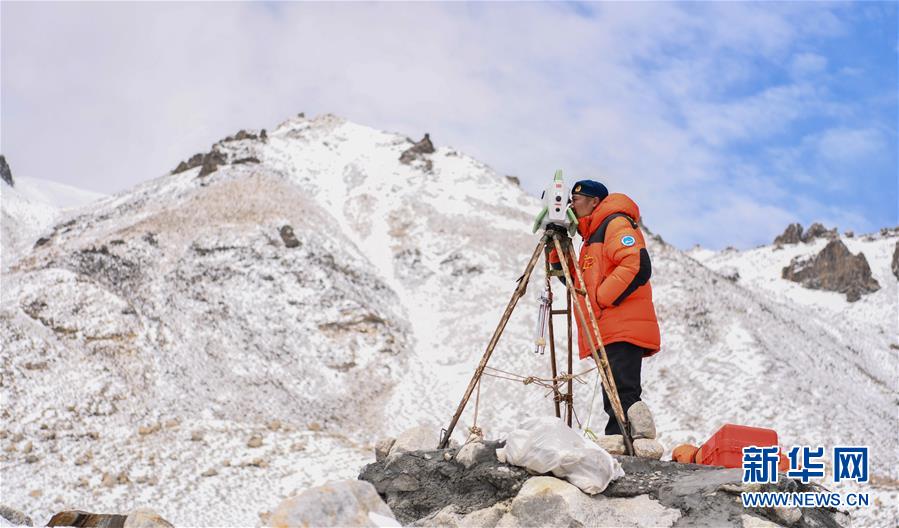 自然資源部第一大地測(cè)量隊(duì)隊(duì)員鄭林在使用全站儀對(duì)珠峰峰頂進(jìn)行交會(huì)觀測(cè)(5月27日攝)。新華社記者普布扎西攝