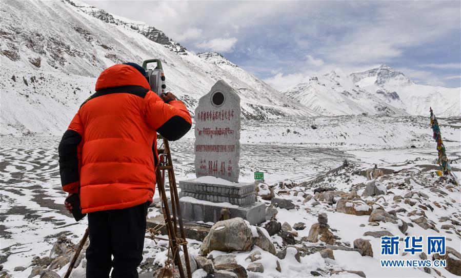 當(dāng)日,2020珠峰高程測(cè)量登山隊(duì)成功登頂后,在珠峰大本營(yíng)的珠峰高程起算點(diǎn),自然資源部第一大地測(cè)量隊(duì)隊(duì)員利用全站儀等儀器對(duì)珠穆朗瑪峰峰頂進(jìn)行交會(huì)觀測(cè)。