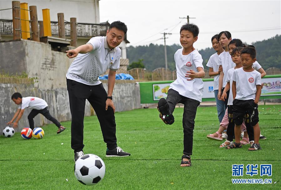 5月27日,在江西省貴溪市金屯鎮(zhèn)金屯村渡坊村小組,志愿者和留守兒童一起進(jìn)行體育活動(dòng)。新華社記者萬象攝