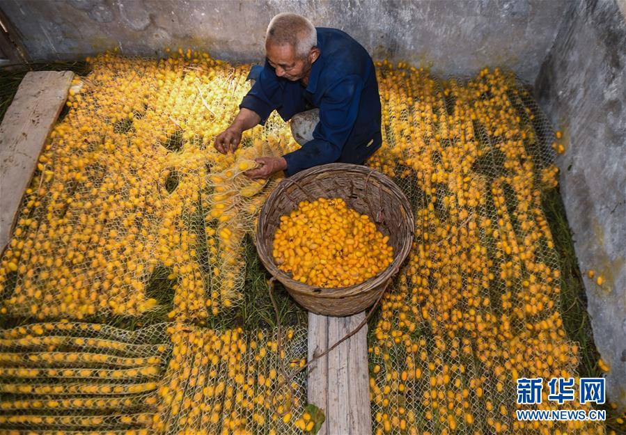 5月27日,桐鄉(xiāng)市鳳鳴街道建勝村70歲的村民宋柏明在收獲“黃金繭”。他今年在桐鄉(xiāng)興民蠶業(yè)專業(yè)合作社的指導(dǎo)下首次養(yǎng)3張黃金蠶繭種,收獲“黃金繭”近400斤,比往年同期增收1500元。近期,蠶桑之鄉(xiāng)浙江省桐鄉(xiāng)市的蠶農(nóng)們迎來了蠶繭豐收的季節(jié),其中新品種“黃金繭”的增收效果尤其明顯。據(jù)介紹,與普通蠶絲相比,色澤金黃的黃金蠶絲中葉黃素含量高,抗菌效果更好,深受市場青睞。2020年春季,浙江省桐鄉(xiāng)市共計(jì)發(fā)放黃金蠶繭種1225張,產(chǎn)量預(yù)計(jì)75噸,總產(chǎn)值近300萬元,較普通蠶繭增收約20%,成為當(dāng)?shù)剞r(nóng)業(yè)增收的亮點(diǎn)。浙江省桐鄉(xiāng)市是我國蠶桑的重要產(chǎn)地,“桐鄉(xiāng)蠶桑習(xí)俗”也被國務(wù)院列入第二批國家級非物質(zhì)文化遺產(chǎn)名錄。新華社記者徐昱攝