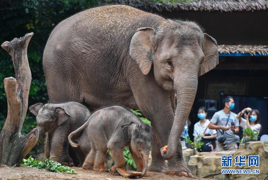 5月27日,廣州長隆的新生亞洲象寶寶與媽媽寸步不離。新華社記者劉大偉攝