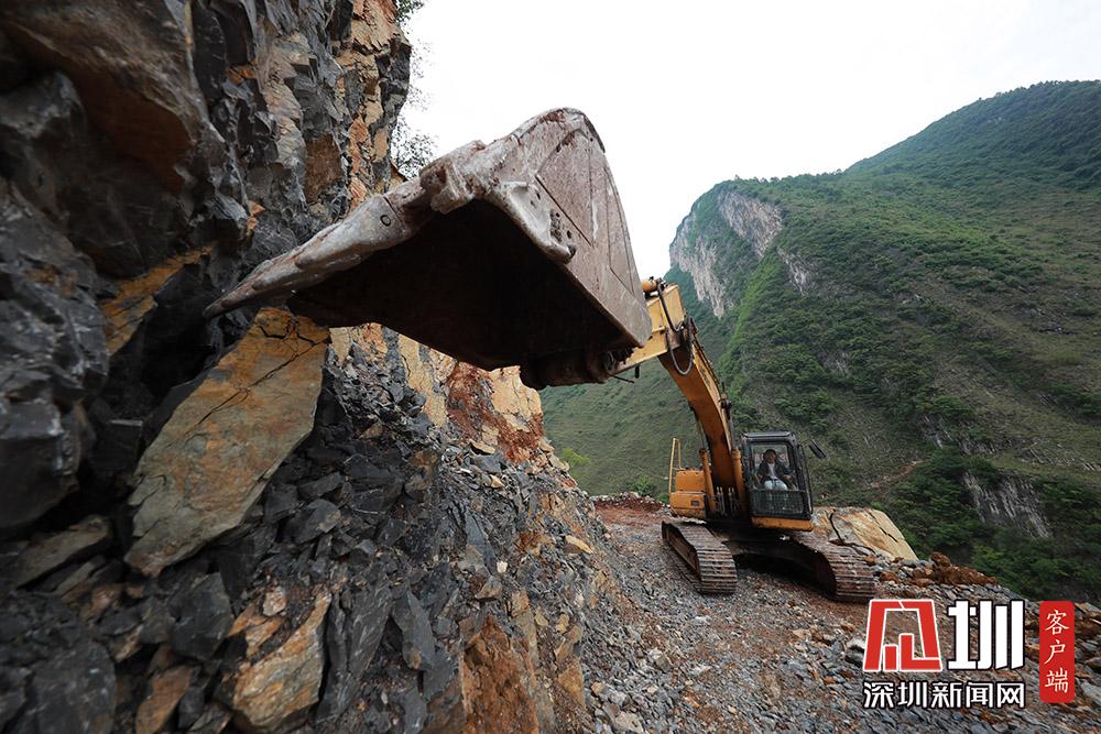 2020年5月27日,在貴州省畢節(jié)市納雍縣化作鄉(xiāng)雙巖頭村,挖掘機(jī)在觀音巖的懸崖邊修路。