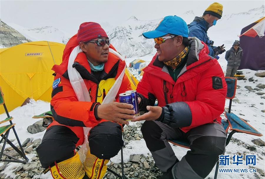 5月28日,測量登山隊員返回前進營地后慶祝登頂。當日,中國2020珠峰高程測量登山隊安全返回海拔6500米的前進營地。5月27日,測量登山隊成功登頂珠穆朗瑪峰并完成峰頂測量等工作。新華社特約記者扎西次仁攝